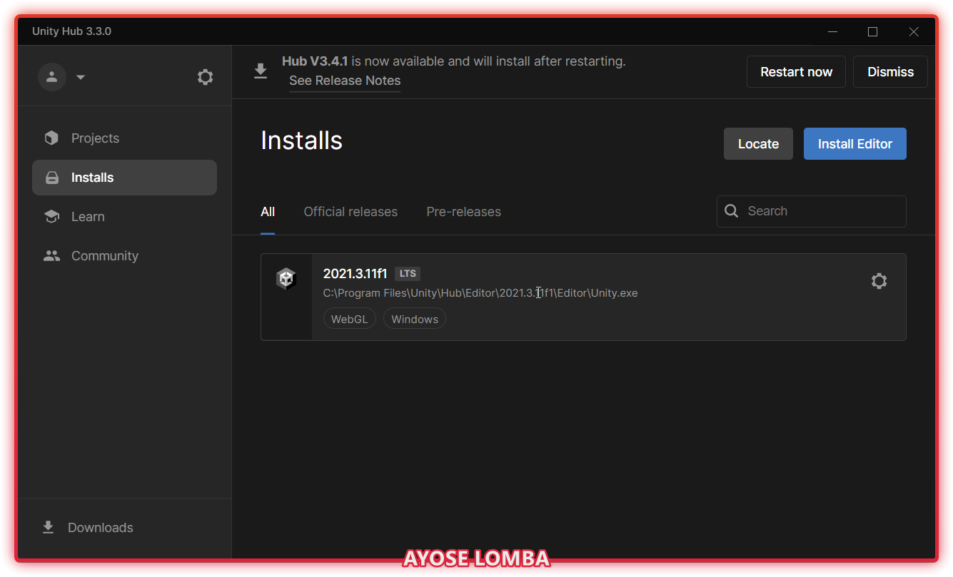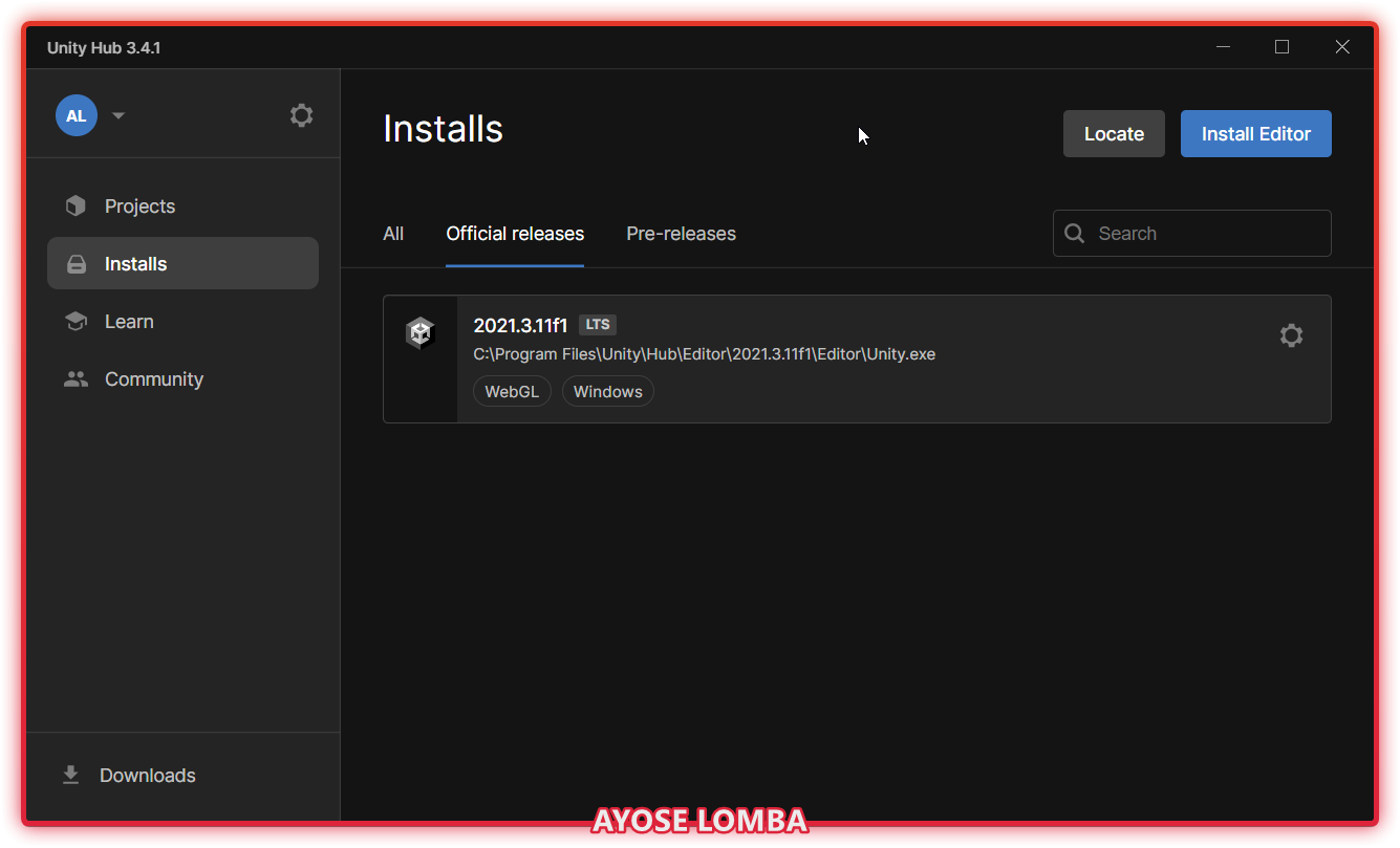 En Unity Hub, la pestaña Installs nos permite gestionar las versiones de Unity en nuestro equipo. Para instalar una versión, usamos el botón Install Editor.